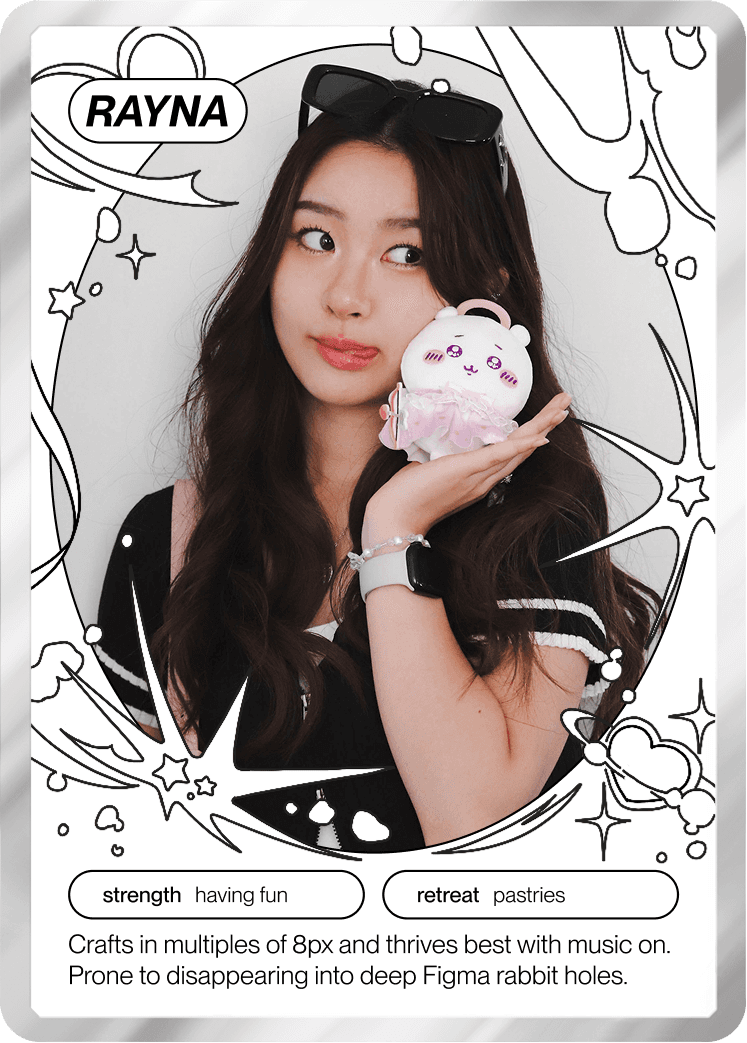Hi, hello! I’m Rayna, a designer (👩🏻💻) living in Vancouver, where the sun is just… optional (🌧️). I spend most of my time turning what-ifs (💭) into things you can click, tap, or experience (✨).